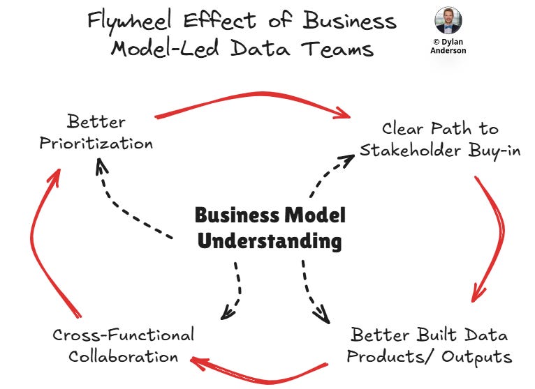 Fourth and finally, cross-functional collaboration. The business model is the one thing every department shares. It ladders up to what matters most and using it as a common reference point breaks down the silos between data, commercial, operations, and finance teams. In the end, you get a shared “so what” that ideally transcends departmental interests, creating a culture of cross-functional delivery. Also, this multi-stakeholder collaborative approach feeds back into better prioritization, demonstrating the flywheel effect that thinking from this perspective creates.